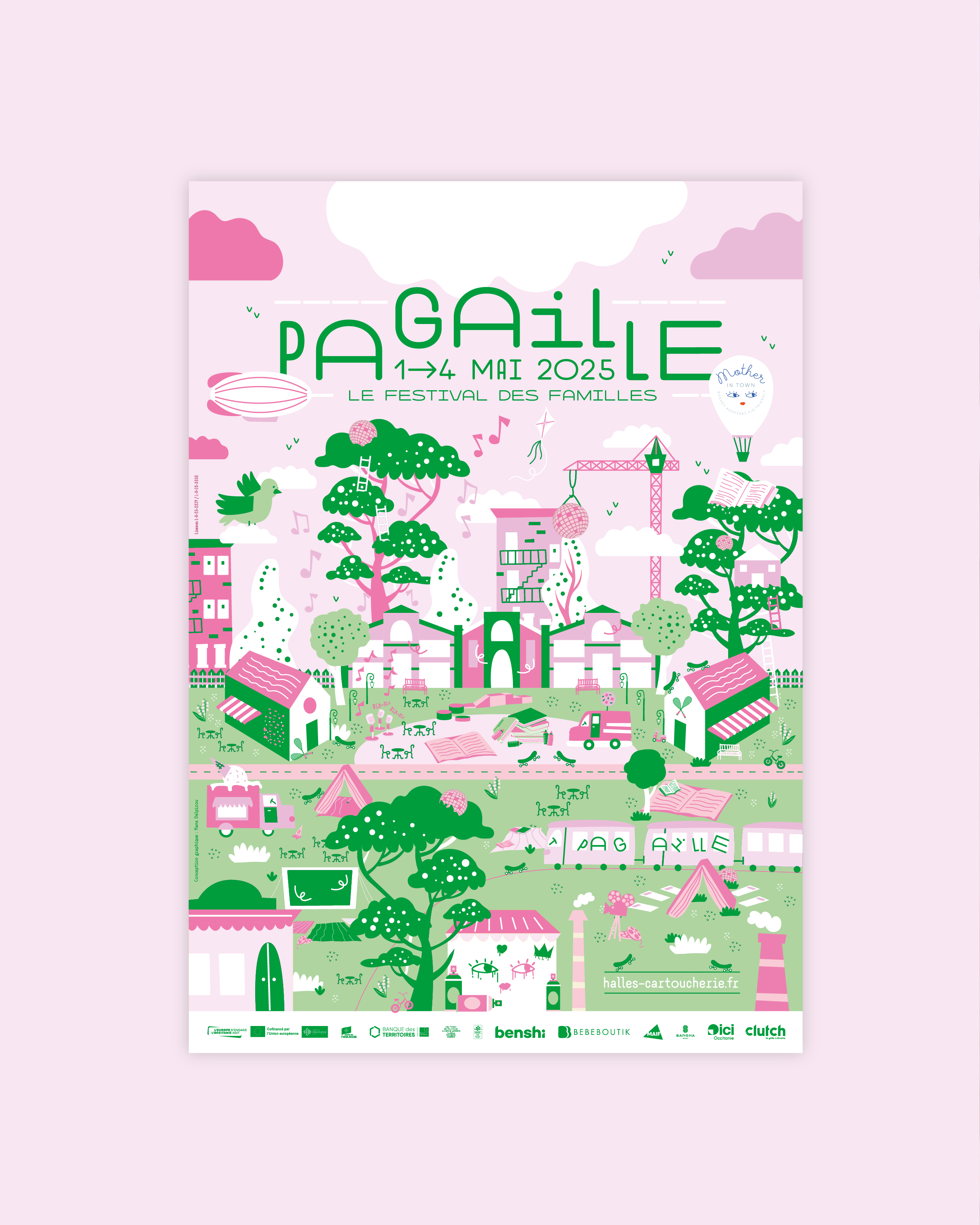 Conçue pour la première édition du festival Pagaille, organisée aux Halles de la Cartoucherie à Toulouse en partenariat avec Mother in Town, cette affiche traduit l’esprit d’un événement intergénérationnel, festif et foisonnant.